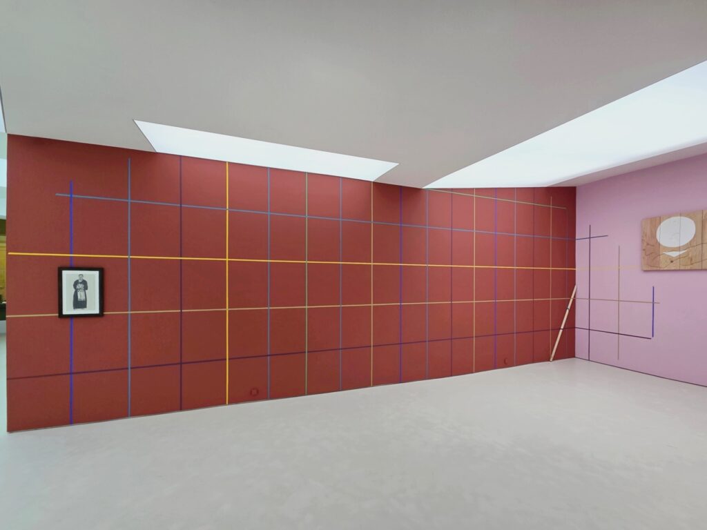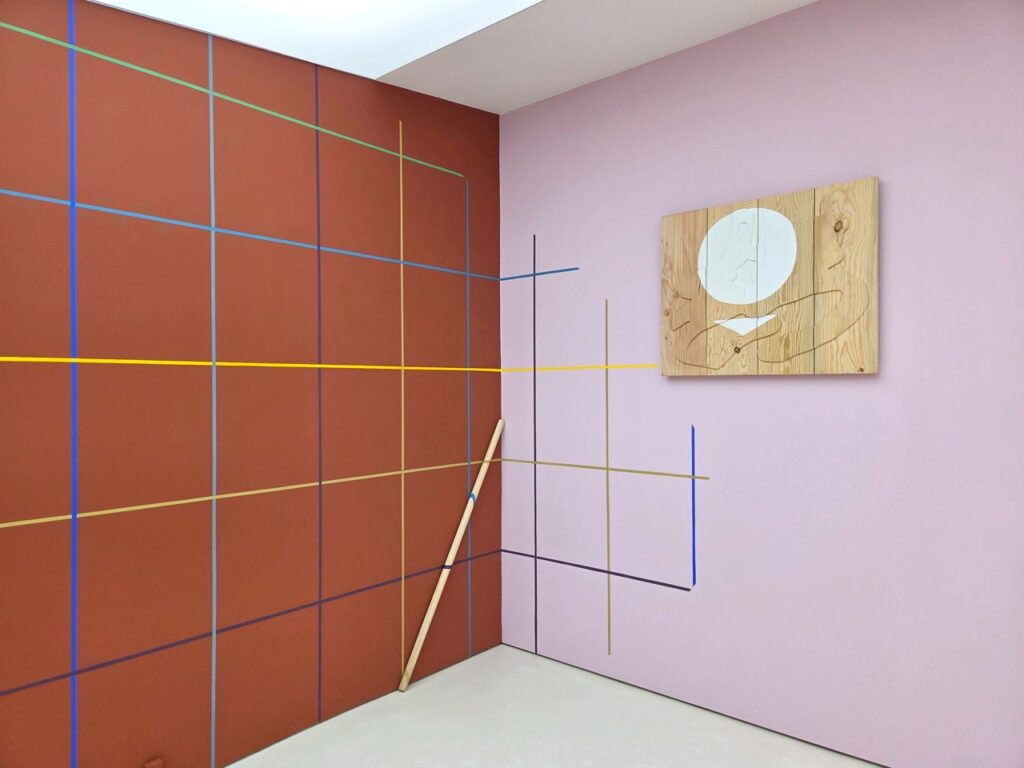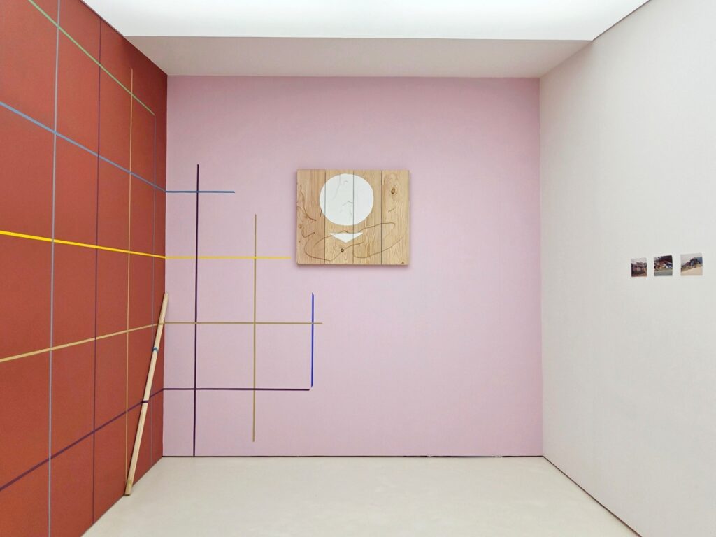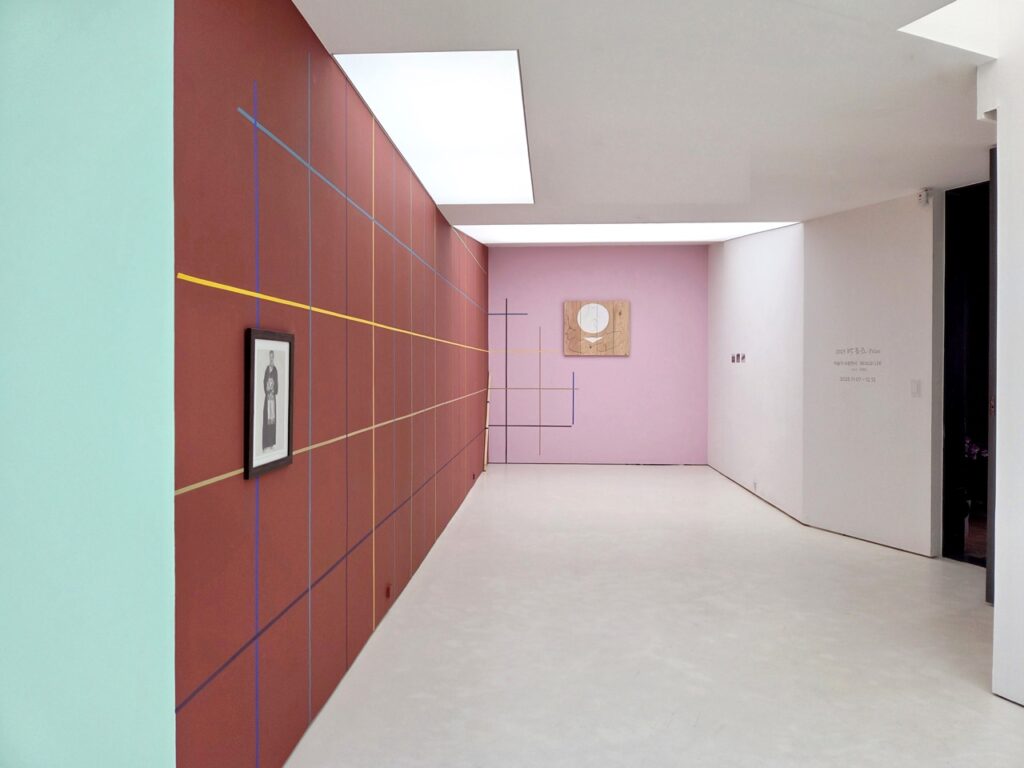 <모시 단청>은 전시장 벽의 색면에 등장하는 격자 선의 단청 벽화이다. 작가는 그리드 구조를 단청의 색으로 변주하는 방식으로 작은 모형과 큰 구조를 통해 다양하게 실험한다. 그리드는 모시 천 씨실 날실의 짜임의 형태로, 문살의 우물 정자 형태로 표상되는 동시에 무수한 빈 공간을 품은 구조이다. 다양한 문화에서 탄생한 격자 형태들은 이질감 없이 이슬기의 작업 언어 안으로 통합되어 전통을 기하학적 형태 안에 담고 실험하는 그의 주요 모티브로 존재해 왔다.