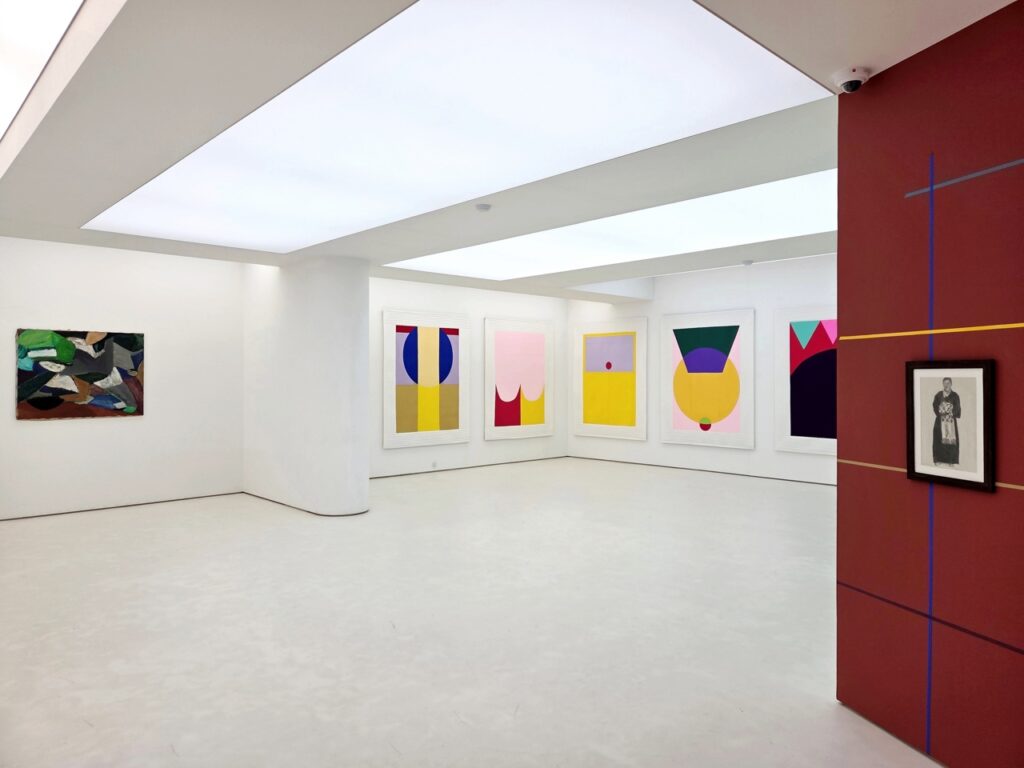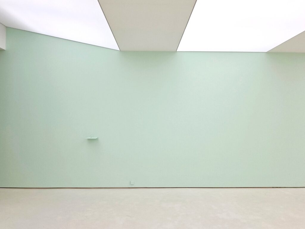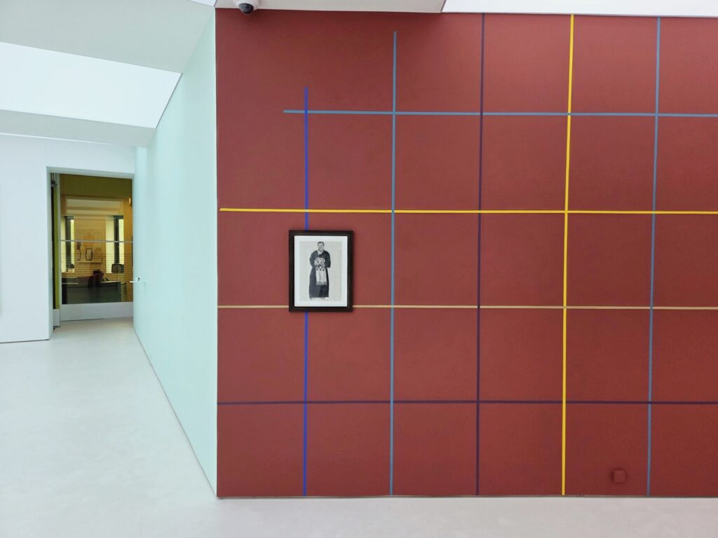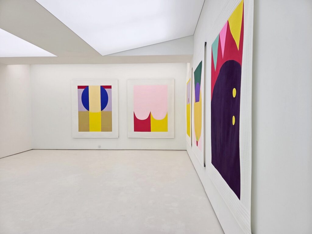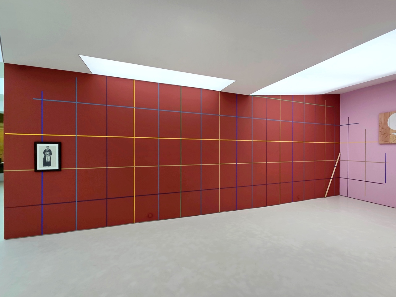 <모시 단청>은 전시장 벽의 색면에 등장하는 격자 선의 단청 벽화이다. 작가는 그리드 구조를 단청의 색으로 변주하는 방식으로 작은 모형과 큰 구조를 통해 다양하게 실험한다. 그리드는 모시 천 씨실 날실의 짜임의 형태로, 문살의 우물 정자 형태로 표상되는 동시에 무수한 빈 공간을 품은 구조이다. 다양한 문화에서 탄생한 격자 형태들은 이질감 없이 이슬기의 작업 언어 안으로 통합되어 전통을 기하학적 형태 안에 담고 실험하는 그의 주요 모티브로 존재해 왔다.
