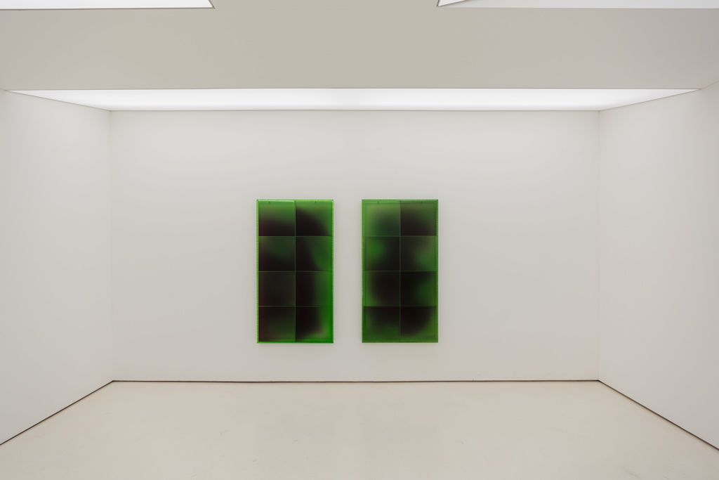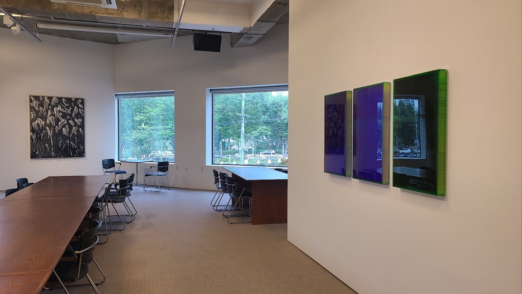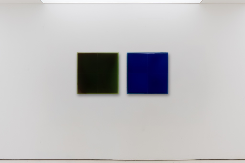 우선, 레진몰탈을 투명하게 사용한다. 혼색하고 겹쳤음에도 색상이 투명해서 어항 속처럼 작품 내부가 보인다. 다음으로, 지지체도 나무 패널이 아니라 아크릴 패널이다. 투명 아크릴로 제작한 사각의 패널에다가 내부에는 격자 모양으로 뼈대를 넣었다. 그 위에 레진몰탈을 부으면 아크릴 패널의 구조가 그대로 드러난다.