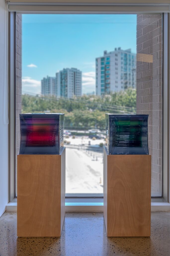 비의도적이었지만 결과적으로 작품에 빛이 된 요소는 또 있다. 작품의 측면도 아크릴 패널 내부의 격자 식 구조 못지않게 작품에 추임새를 더한다. 물론 측면의 표정이 확연히 보이는 작품은 레진몰탈이 불투명한 전작들이다.