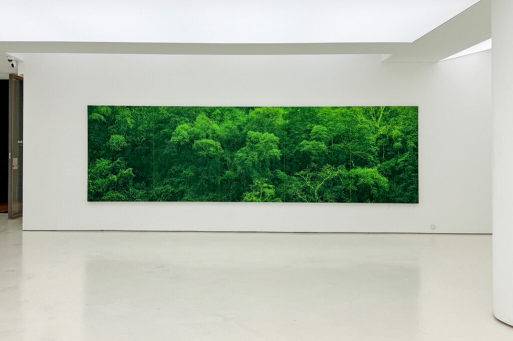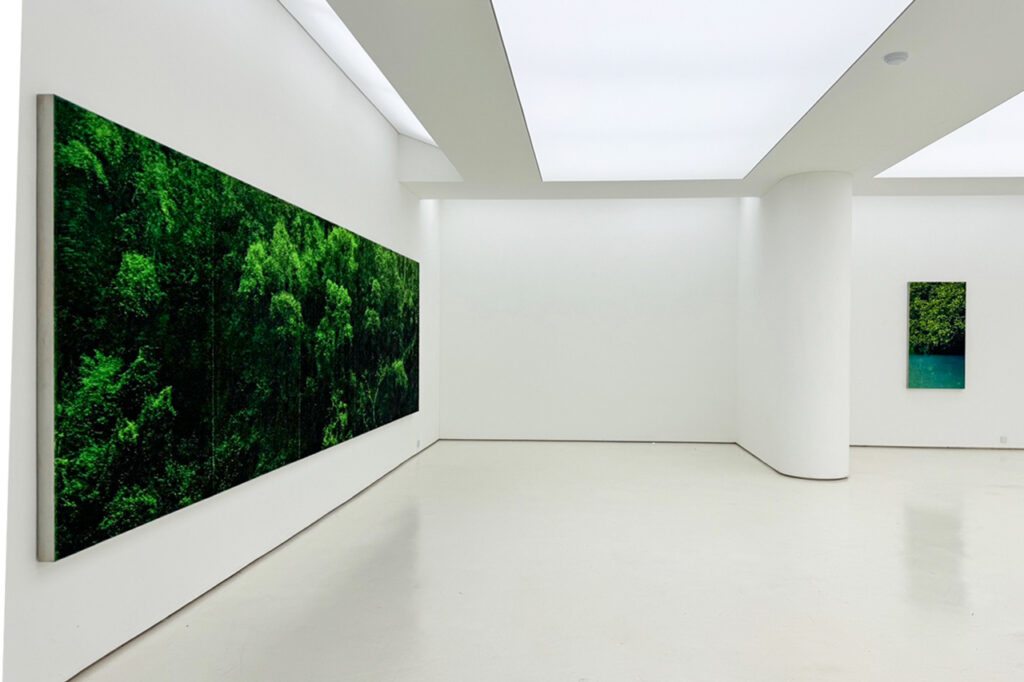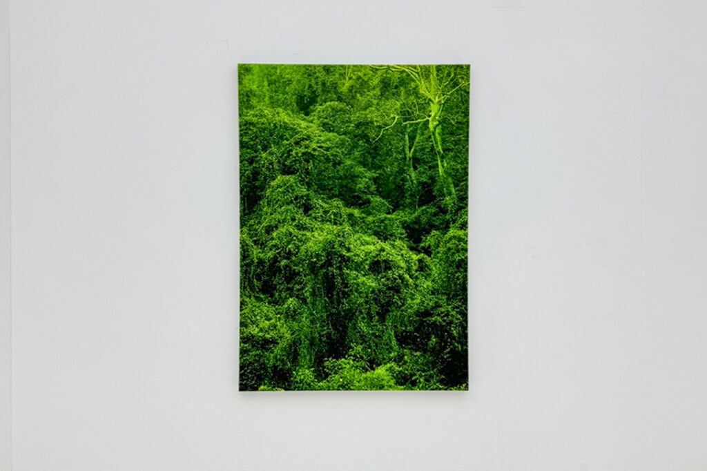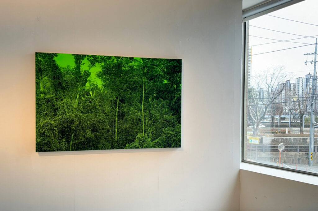 유봉상 작품의 시작은 모든 창작의 과정이 그러하듯 ‘리서치’부터 시작된다. 인터넷을 통해 호수나 강에서 배를 타고 물 위에서 바라볼 수 있는 숲을 고른다. ‘고른다’라는 고작 한 단어로 표현하기에는 섭섭할 정도로 복잡하고 지난한 과정을 거쳐야 한다. 어둠과 밝음이 조화를 이룬, 톤의 다양함을 담은 숲, 작품으로 제작해 걸었을 때의 느낌 등을 고려하며 숲을 찾는다. 어둠이 깊어야 빛이 환하듯, 어둠이 깊은 숲으로는 열대우림의 식생을 가진 숲이 적합하다.