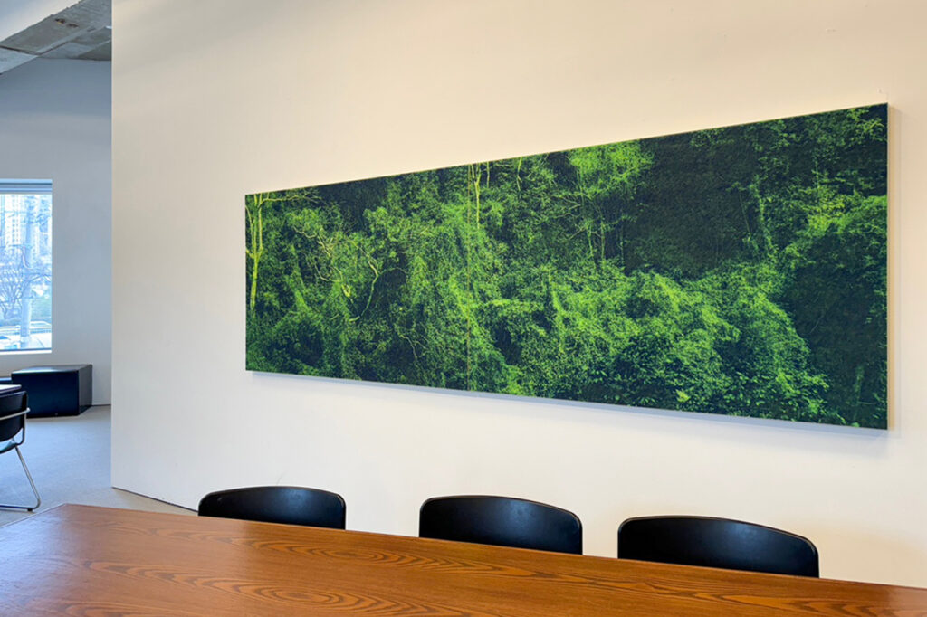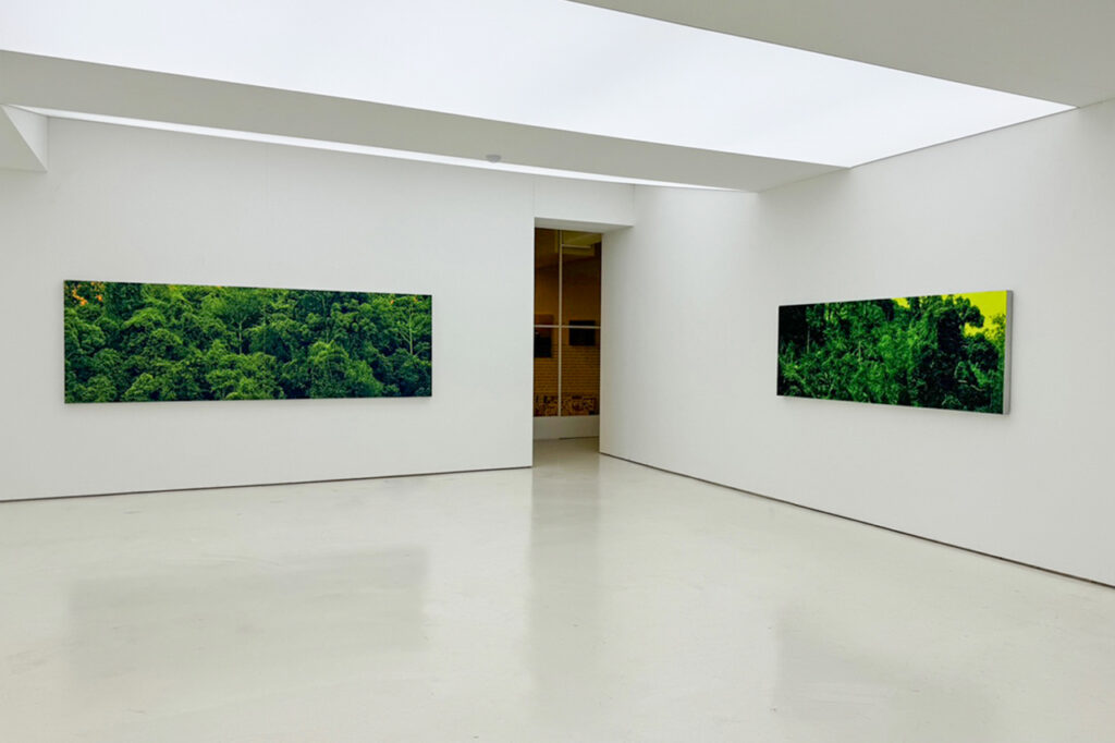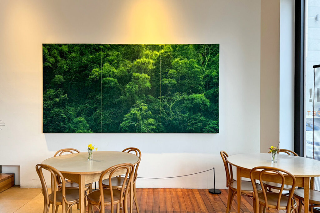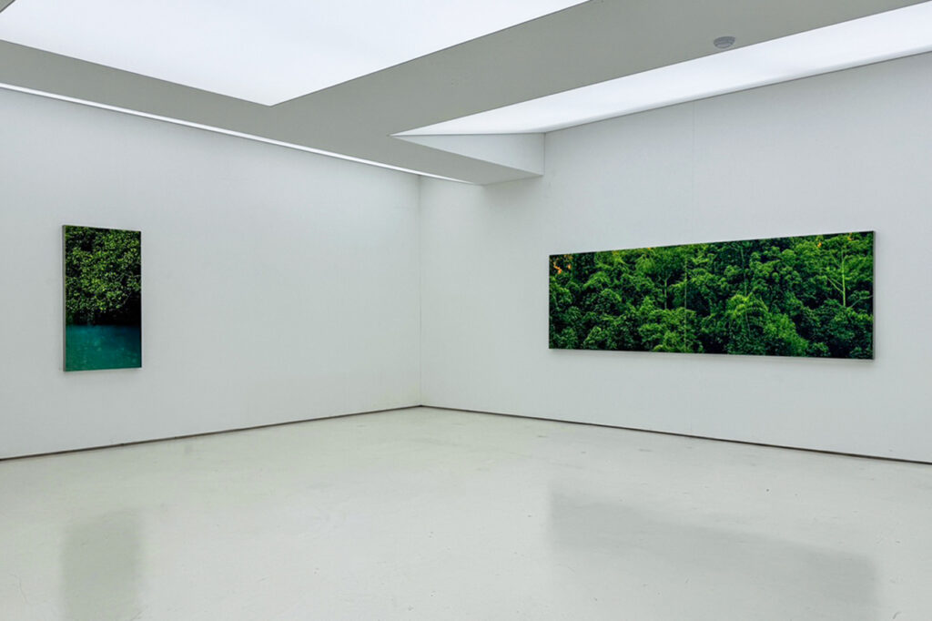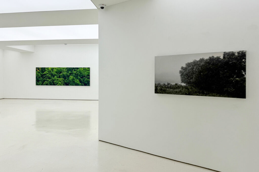 유봉상 작품의 시작은 모든 창작의 과정이 그러하듯 ‘리서치’부터 시작된다. 인터넷을 통해 호수나 강에서 배를 타고 물 위에서 바라볼 수 있는 숲을 고른다. ‘고른다’라는 고작 한 단어로 표현하기에는 섭섭할 정도로 복잡하고 지난한 과정을 거쳐야 한다. 어둠과 밝음이 조화를 이룬, 톤의 다양함을 담은 숲, 작품으로 제작해 걸었을 때의 느낌 등을 고려하며 숲을 찾는다. 어둠이 깊어야 빛이 환하듯, 어둠이 깊은 숲으로는 열대우림의 식생을 가진 숲이 적합하다.