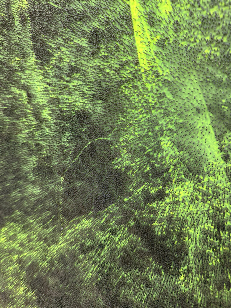 유봉상의 작업은 근사한 데님 앞치마에 물감을 묻히며 부드러운 붓으로 캔버스를 적시는 작업과는 사뭇 다르다. 사람의 팔로는 들 수 없는 무게의 판넬을 기계를 이용해 작업대에 세우고 그 위에 에어태커를 이용해 15mm 헤드리스 핀못을 반만 박아넣어 7mm 길이를 남긴다. 작업실 밖에서 들려오는 소리는 폭력적이기까지 하다. ‘못’이라는 폭압적인 재료를 활용해, 에어태커를 이용한 폭력적인 작업, 그리고 탄생하는 작품은 ‘못’이라는 실재하는 것으로 만들어낸 7mm의 그늘이 만들어낸 빛의 세계다.