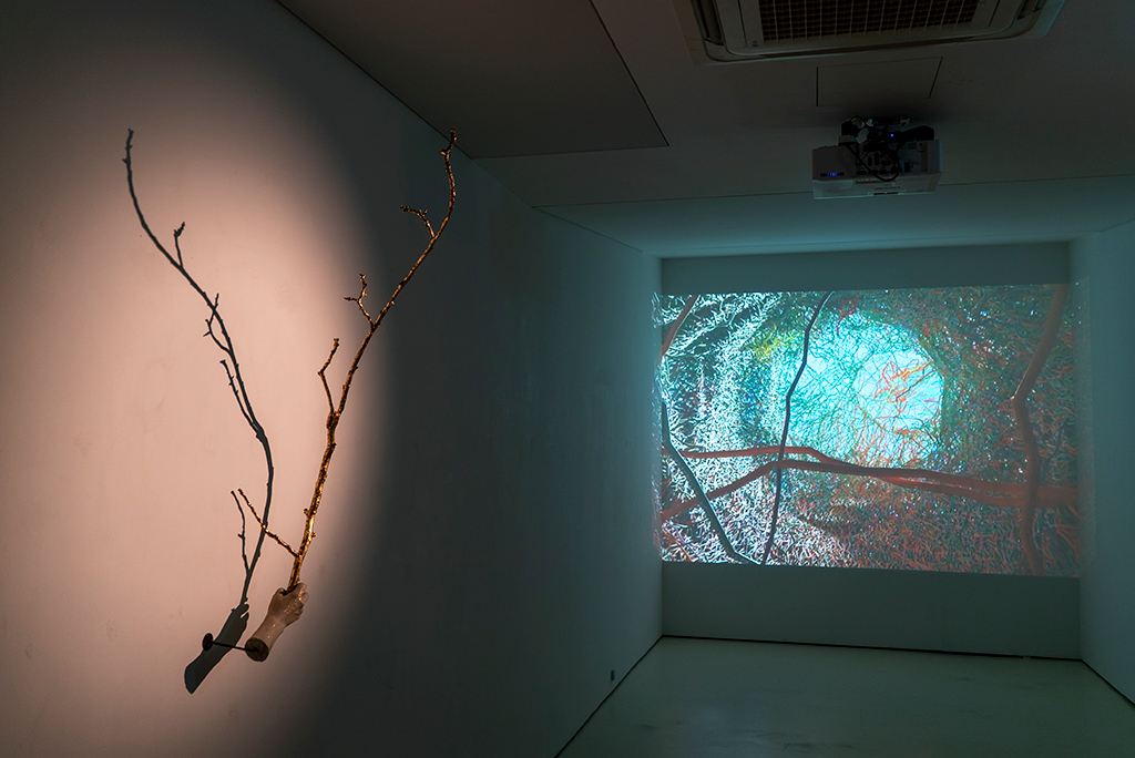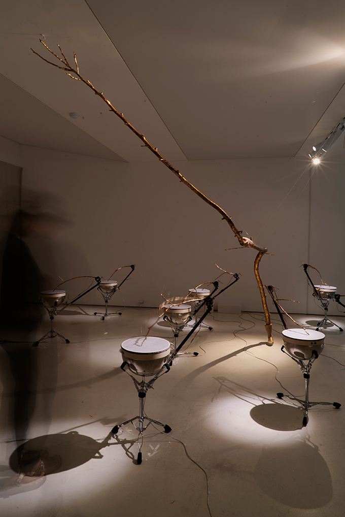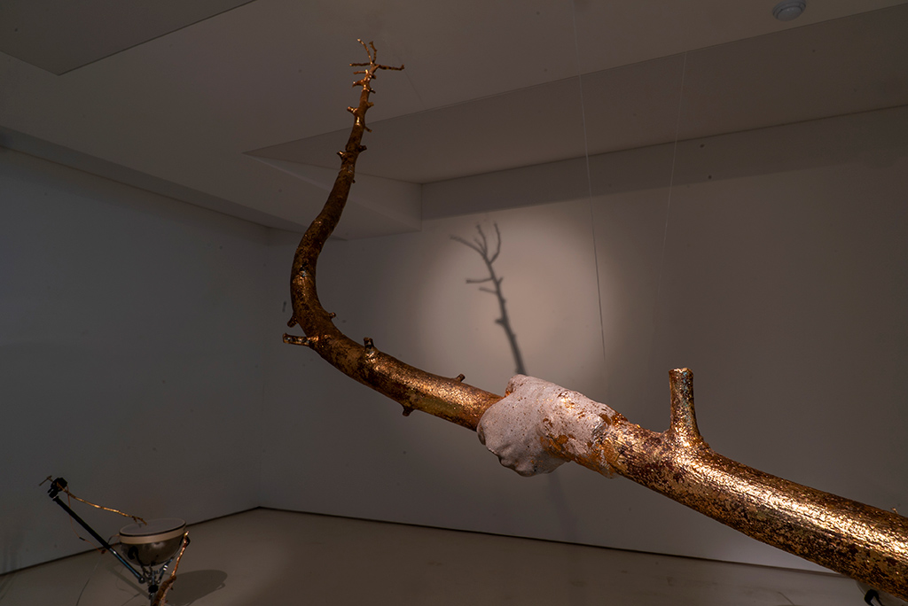 갤러리 문을 열자마자 마주 보는 벽면에는 한 손에 잡힌 채 수직으로 뻗은 호두나무 가지 하나가 특별한 조각상처럼 걸려있다. 작가의 오른손을 캐스팅한 시멘트 재질의 손에 생생히 드러난 혈관에서, 또 잘린 손목과 잘린 나뭇가지의 대비에서 나무를 수호하지 못한 데 대한 작가의 안타까움이 묻어난다. 관람자의 동선은 이제 스네어 드럼들로 옮겨가게 된다. 금속 지지대에 놓인 이 작은 북들 각각에는 작가가 마당에서 주운 가느다란 호두나무 가지들이 달려 있다. 관람자의 발걸음을 감지한 센서에 의해 나뭇가지들은 북을 두드리기 시작한다. 이번 전시 주제를 관통하는 단어들, 예컨대 생성, 무한, 변이, 연접 등 15개의 단어를 모스부호로 치환한 리듬이 타다닥 탁탁 울린다. ‘만약 나무가 소리를 낼 수 있다면?’이라는 가정에서 출발한 이 작품에서 스네어 드럼이 울리는 소리는 자연을 훼손하는 사람들에게 보내는 경고음일 수도 있다. 황금색으로 칠한 크고 작은 나뭇가지들은 작가가 나무에, 또 소중한 생명에 보내는 경의이자 엘레지(elegy)의 표상이라 하겠다. 마지막으로 관람자의 동선은 호두나무를 3D 모델링해서 3D로 작업한 영상에 닿게 된다. 나무 둥지 안에서 위를 올려다보는 시점에서 나뭇가지들이 점진적으로 형성되고 확장되는 과정을 담아 마치 인간 신경조직과 흡사해 보이는 이 작품은 생명력의 위대함을 전한다.