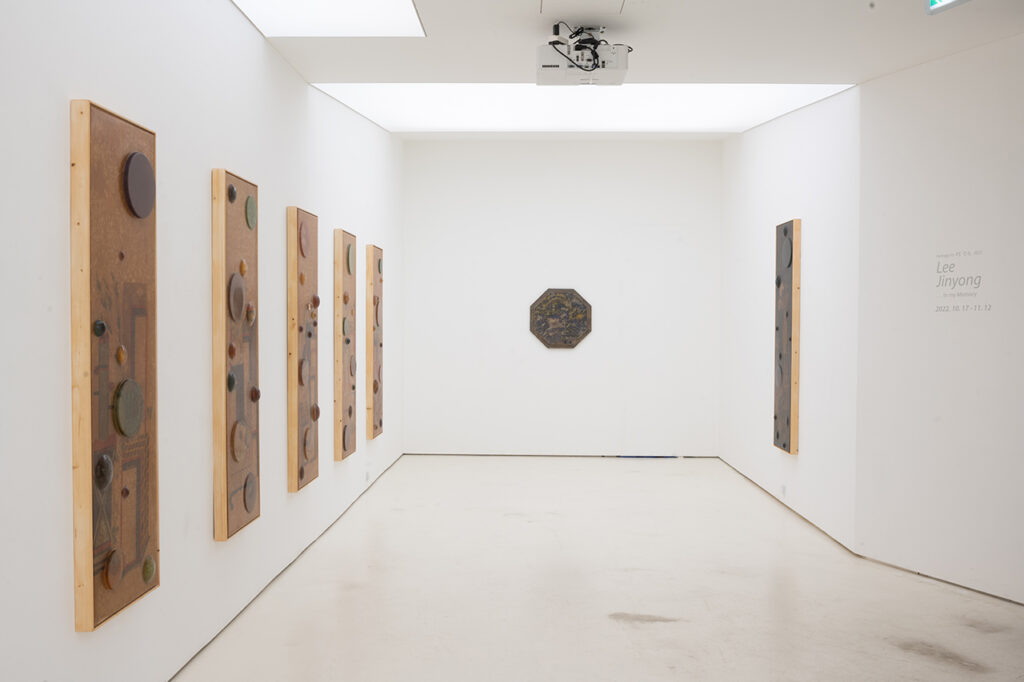 자신이 수집한 희귀물품들을 본인의 작품에 끌어들이는 작품으로 널리 알려져 있는 이진용 작가는 갤러리분도와 깊은 인연을 이어가고 있다. 2012년 분도 개인전 <쓸모 있는 과거>, 2015년 <5015. 158. 43>, 2019년 박동준 선생의 살아생전 마지막 전시였던 <메타 콜렉션>으로 대구지역에 이진용 작가를 꾸준히 소개했다. 갤러리분도 첫 번째 전시 <쓸모 있는 과거>에서는 가방과 도자기 콜렉션을 화폭에 옮긴 회화작품과 레진 연작을 주로 선보였다. 3년 뒤 <5015. 158. 43> 전시에서는 캐스팅한 낱개 조각에 한지를 입히고 붓으로 활자체를 그린 무수한 가상의 활자본들을 부조 형식으로 완성한 작업을 공개했다. 엄청난 시간과 자본과 노력이 투여된 활자 연작은 인류의 문명사와 작가의 개인사를 연결한 기획으로 시도된 바가 있다. 세 번째 전시 <메타 콜렉션>은 펭귄 출판사가 펴낸 책을 그린 회화로, 굉장히 오래된 빈티지 북을 대상으로 한 작품을 통해 시간의 축척을 표현한 것이었다.