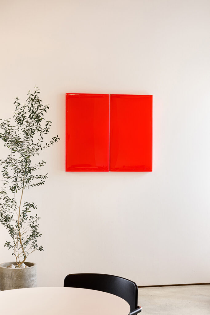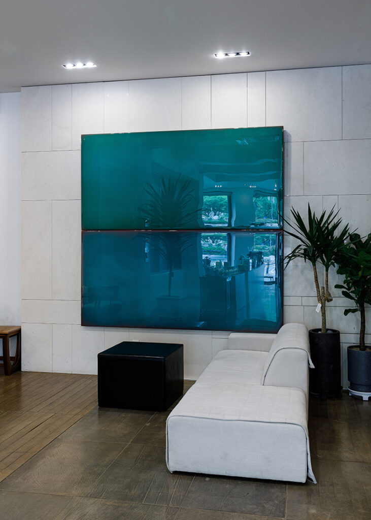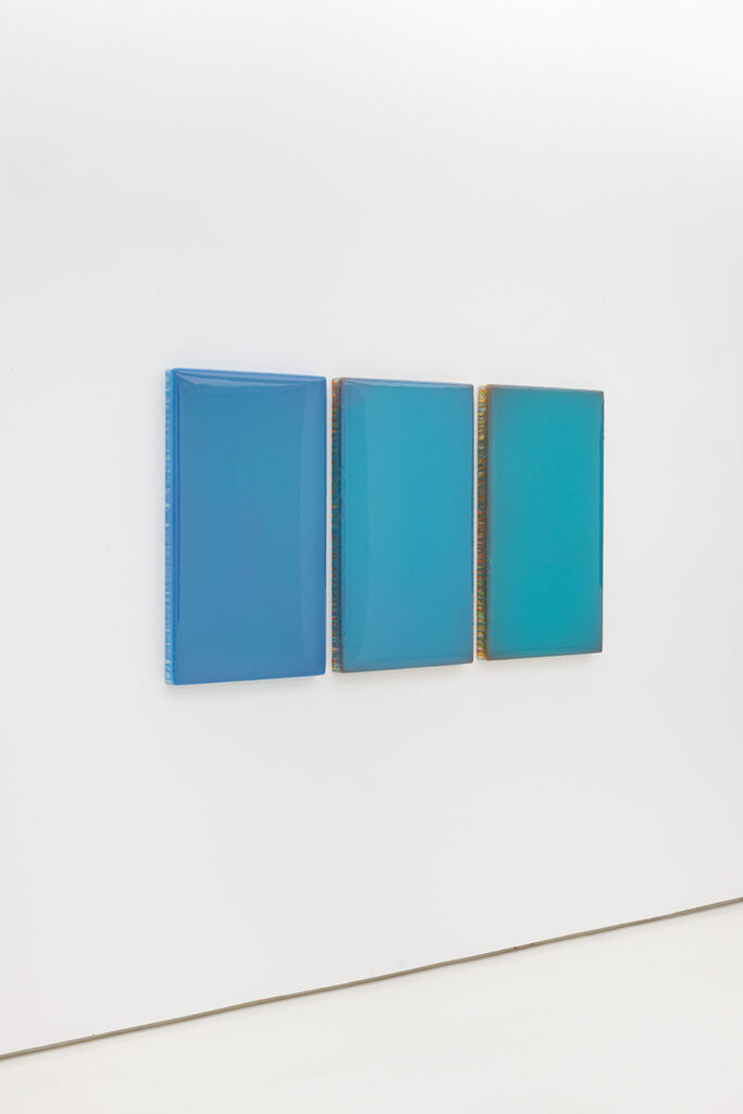 인더스트리_페인팅은 2009년에 <무제> 시리즈- 캔버스 위에 에폭시 수지 페인트로 작업한 것부터 시작해 2015년 봉산문화회관에서 개최한 개인전에 처음 선 보이고 계속 작업을 이어오고 있다. 멀티-레이어드 레진몰탈 캐스팅 작업은 가로 210mm x 세로 90mm x 높이 25mm의 틀을 만들어 자신이 직접 제조하여 만든 인더스트리_물감을 부어 ‘조각’을 만든다. 그는 투명 레진 몰탈에 아크릴 물감으로 조색할 때 매번 미소한 차이를 갖도록 한다. 벽면에 설치된 여러 작품들은 물감을 여러 번 중첩시킨 결과물로 컬러의 깊이감이 묘한 색채감을 느끼게 하며 빛나는 컬러는 매혹적이다.