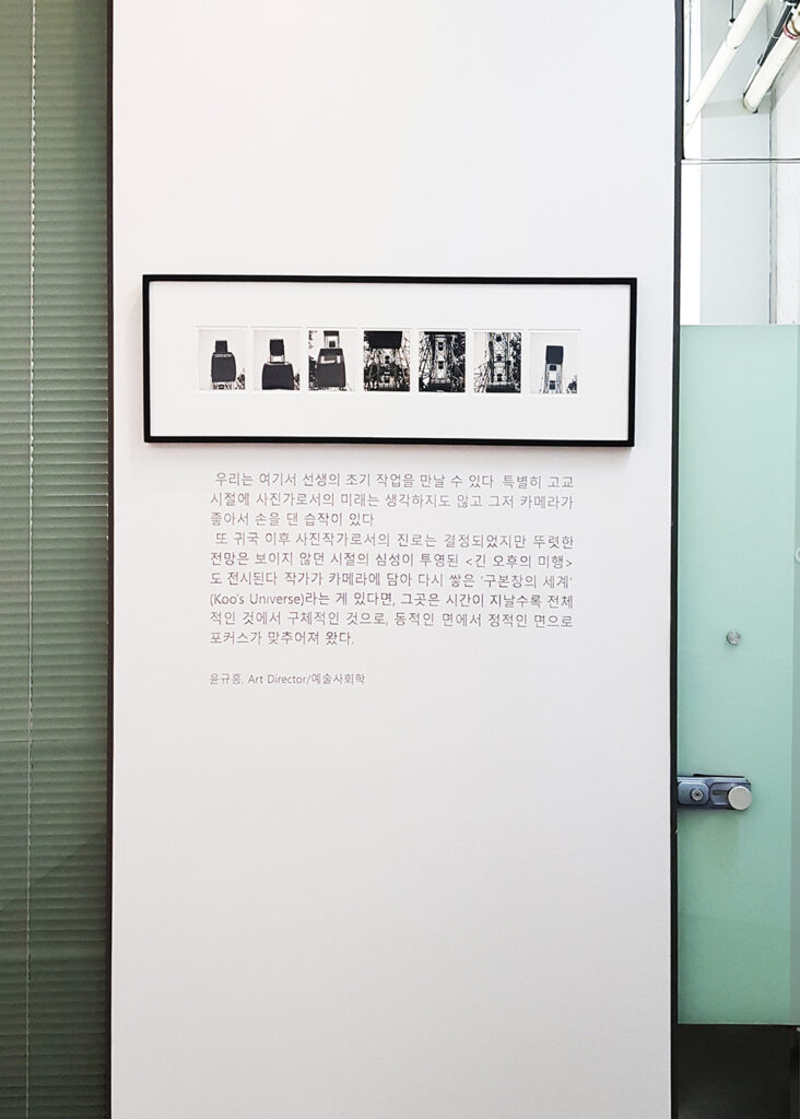 우리는 여기서 선생의 초기 작업을 만날 수 있다. 특별히 고교 시절에 사진가로서의 미래는 생각하지도 않고 그저 카메라가 좋아서 손을 댄 습작이 있다. 독일 유학 시절에 선생이 받아들인 이국정취를 담은 작품도 선보인다. 또 귀국 이후 사진작가로서의 진로는 결정되었지만 뚜렷한 전망은 보이지 않던 시절의 심성이 투영된 <긴 오후의 미행>도 전시된다. 작가가 카메라에 담아 다시 쌓은 ‘구본창의 세계’(Koo’s Universe)라는 게 있다면, 그곳은 시간이 지날수록 전체적인 것에서 구체적인 것으로, 동적인 면에서 정적인 면으로 포커스가 맞추어져 왔다.