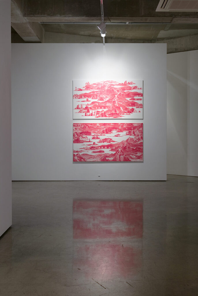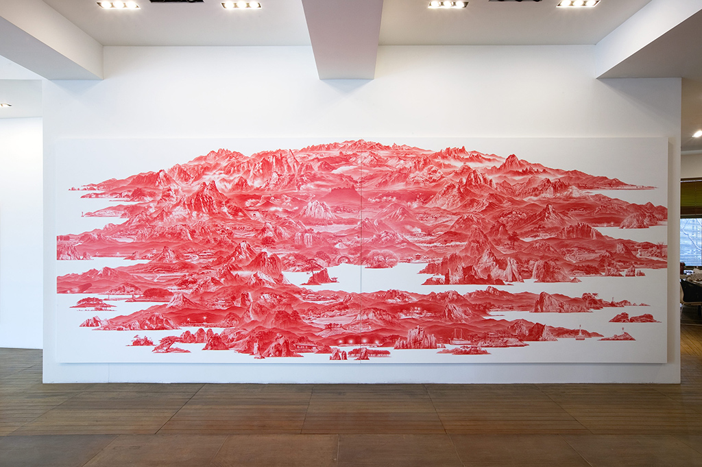 그가 군 생활을 보낸 곳은 휴전선 앞에서 경계근무를 서야 하는 전방 부대였다고 한다. 여기서 작가는 캄캄한 밤의 전선을 살펴보는 적외선 투시경을 들여다 봐야했고, 그 기기가 제공한 이미지는 곧 붉은 풍경으로 화폭에 옮겨졌다. 말이 쉬워서 하는 거지만, 그가 보병이 아니라 나처럼 전차승무원이었더라면 그의 작품은 열영상 조준경를 통해서 녹색 그림으로 남았을 지도 모르는 일이다. 아무튼 그가 학교 졸업 이후 보장된 평탄한 삶 대신 택한 영국 유학은 또 하나의 계기가 되었다고 한다. 런던에 있는 첼시 칼리지 오브 아츠를 학교 구경도 못해본 나로서는 그게 작가 이세현이 완성태의 작가로 도달하는데 어떤 동기를 줬는지 모른다. 그 시기에 영국의 일반 학제적 분위기에 관해선 나도 좀 안다. 예술은 자연과학과 사회과학이 일궈낸 이론을 독창적으로 사유하고 표현한다. 그 당시에 이미 탈근대주의 패러다임에 대한 폐기가 공공연히 이뤄졌고, 성찰적 근대화 패러다임조차 그것의 대안이 되기에 마땅치 못한 사회현상이 곳곳에서 벌어지던 영국의 미술은 미술시장 그리고 유명작가들의 등장으로 한껏 고무되어 미술인들에게 새로운 개념의 예술가상을 세우게끔 했다. 이런 미술계의 자긍심은 예술과 문예사상의 무용론이라는 냉소와 불안이 이미 퍼졌고, 결국 브렉시트로 어두워진 지금의 영국에 대한 우려가 나오던 사회학의 전망과는 다른 것이었다.