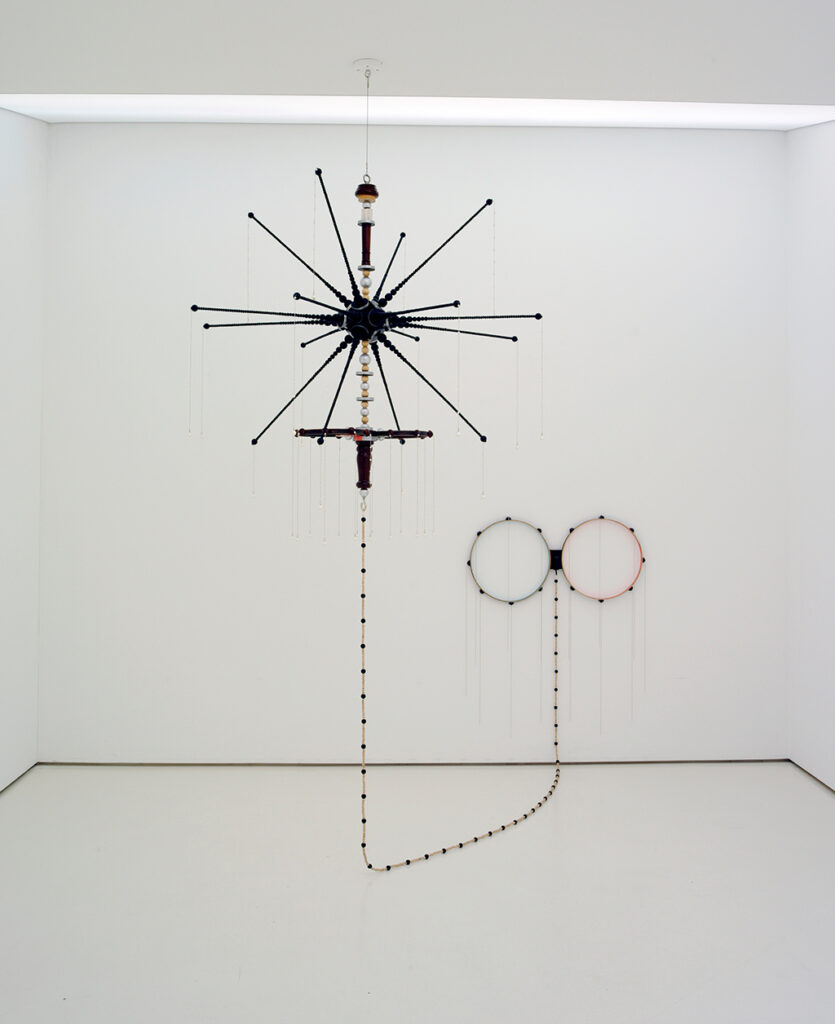 Skin_Layer, 2023, 수집된 오브제, 나무에 체색, 구슬, 레이스, 135 x 46 x 243(H)cm