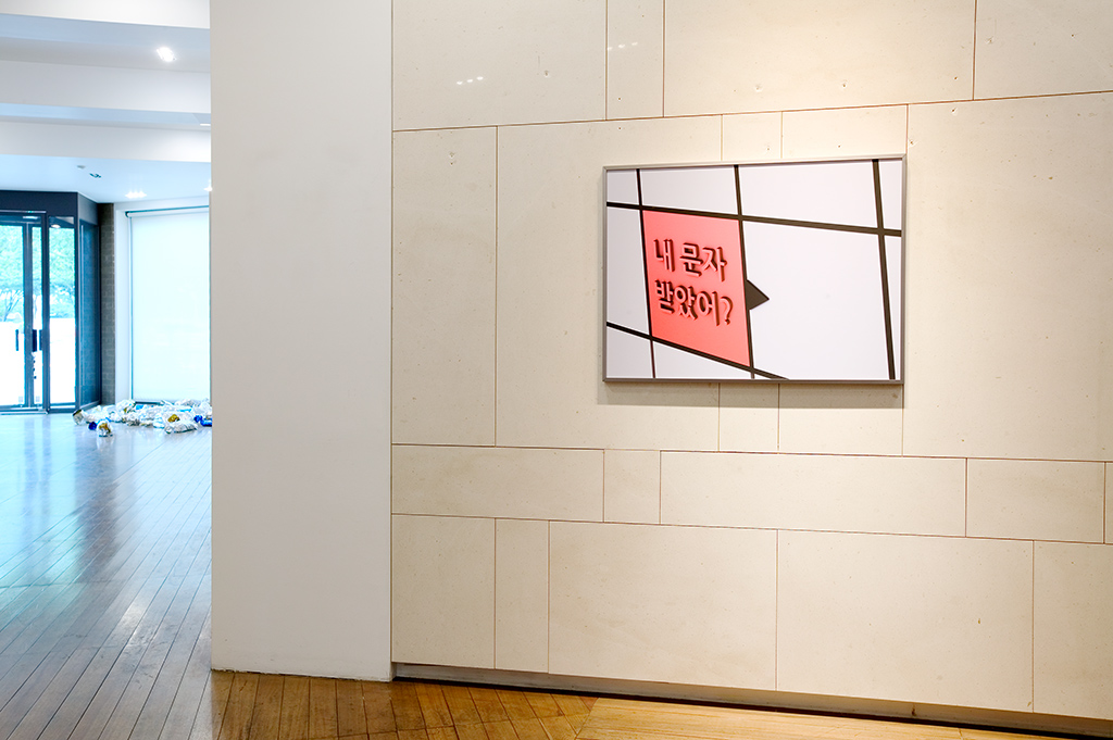바로 뒷 벽면을 채운 작품 서베이(Survey)도 시야에 꽉 차게 들어온다. ‘더 이상 악화될 수 없다/아직 더 악화될 수 있다/다 잘 됐어. 뭐가 문제야’라는 한글 문구가 흑백의 대비 가운데 적혀있다. 설명이 없다면 참 뜬금없다. 뭔가 하면, 이런 걸 가정해보자. 선거를 통해서 누가 당선되고 누가 낙선을 했다면, 이에 대한 우리 반응은 각자 엇갈릴 거다. 세 가지 항목 가운데 한 가지 반응을 찍으면 된다. 작가는 친절하게도 벽면 디자인과 똑같은 모양으로 된 우편엽서를 준비해 놓았다. 관람자는 엽서를 갖고 가서 몇 가지를 채워서 우체통에 넣으면 된다. 요쿰이 신경 쓴 건 벽화와 같이 세 항목 가운데 택일하는 앞면만큼 뒷면에 적힌 주관식 물음이다. 일단 이 메시지의 발화자인 작가 본인에게 물음을 던진다면 객관식 문항은 2번을 택했을 것이고, 주관식 문항에는 선거 제도가 갖는 맹점 혹은 독재에 침해받는 예술의 자율성에 관한 이야기를 쓸 것 같다. 다시 말해, 그가 태어나고 자란 오스트리아와 그가 현재 살고 있는 미국, 두 나라의 정치 상황은 극우 정치인들이 권력을 잡은 공통점이 있는데, 이게 다 선거 득표수로 한 쪽이 나머지 다양한 목소리를 잠재워버리는 대의민주주의에 관한 의문으로 해석된다. 정치가 그렇다면, 이는 예컨대 과학에서 예컨대 사회과학에서 양적인 연구방법과 질적인 연구방법 사이의 대립, 나아가 실증주의와 해석학 간의 논쟁을 떠올리게끔 한다. 하지만 작가는 우리에게 정답을 강요하지는 않고, 그 자신도 감상적인 프로파간다로 빠지지도 않는다. 그건 그렇고, 내가 작가라면 더 생생한 말투를 썼을 것이다. 이를테면 “완전 엿 됐어/이건 시작에 불과한 듯/그래서, 뭐 어쩌라고?” 식으로.