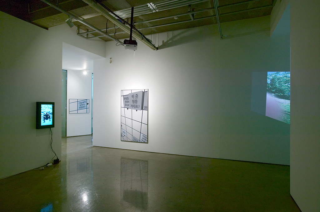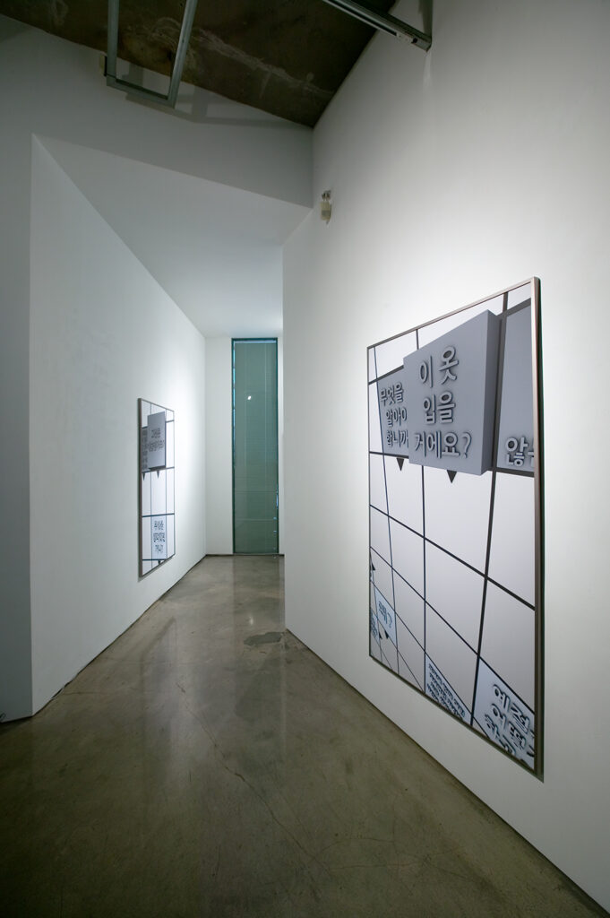 그리고 문제작, 크로스워드 프로젝트(Crossword Project). 문제가 딴 게 아니라, 이 글을 쓰는 시점에 내가 작품이 실현된 것을 못 본 가운데 써야하는 입장 때문이다. 낱말 맞추기는 먼저 제시되거나 맞힌 단어가 실마리가 되어서 남은 빈칸을 메워가는 것이다. 그런데 이 퍼즐의 물음에는 그와 같은 길잡이가 없다. 다름 아니라 영상 사진 작업에 대한 내 상황과 같으므로, 더 이상 어설픈 설명 없이 통과! 이 부분은 언제라도 보충되거나 수정할 수 있으므로 또 달리 쓰일 수 있는 문단이 이 지점이다. 하긴, 작가가 자기 예술을 통째로 아는 듯 이야기를 늘어놓는 평론가보다 나처럼 겸손한 관찰자가 있다는 게 크게 불쾌하진 않을 것 같기도 한데, 글쎄. 롤랑 바르트(Roland Barthes)가 일본을 처음 방문했을 때 뭣보다 그 나라의 글자를 보고 하나의 기호로 받아들인 인상을 책으로 엮은 게 <기호의 제국> 아닌가. 리처드 요쿰의 눈에 처음 들어 온 한글 또한 다를 바 없었을 것이다. 앞선 <서베이>도 그랬고, 이 작품에 배열된 한글이 내가 한국인임에도 불구하고 머리에 곧장 인지되지 않는 이유가 있다. 한 나라 말을 다른 언어로 바꿀 때 어쩔 수 없이 생기는 틈은 예컨대 언어학적 화용론에서 다룰 법한 주제다. 만약 작가가 이런 점까지도 본인이 강조한 사회적인 이매지네이션(Social Imagination)의 한 요소로 채택했다면, 그는 천재가 분명하다. 아니라면 그 점을 잡아낸 내가 대단하단 건데, 꼭 그렇진 않고 그냥 뒤끝 있는 참견꾼 정도라고 해두자.