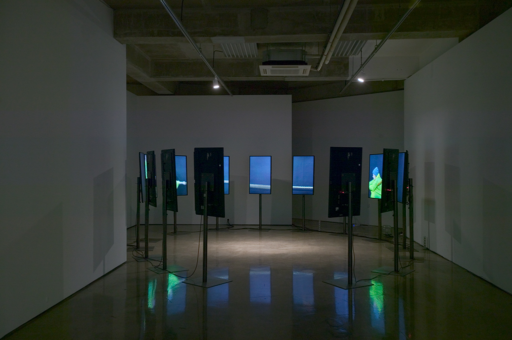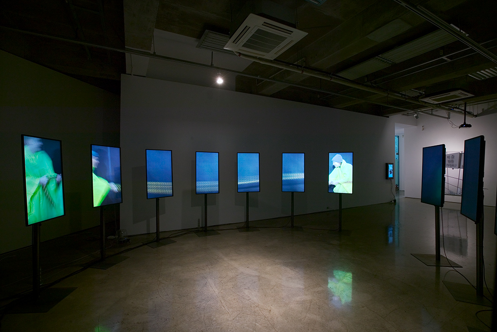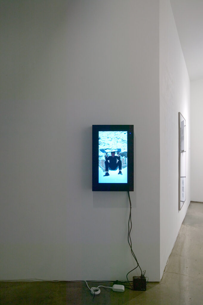 갤러리의 구석에 투 채널 식인 것 마냥 설치한 캐치(Catch)는 이번 전시에 소개된 작품 가운데 내가 가장 좋아하는 작품이다. 이 작품에 등장한 요쿰은 웃고 있다. 보는 나도 한 순간 행복해진다. 슬로우 모션으로 진행된 이 작품은 뉴욕 센트럴 파크에서 두 사람이 핸드폰으로 서로를 찍은 동영상을 동기화해서 붙인 영상이다. 두 개의 화면은 매혹적인 대위법을 이루면서 그들 삶과 예술의 한 부분을 기록했다. 로우 테크놀로지로 뽑아낸 최상의 미디어 아트라면 이건 과한 레토릭일까?
