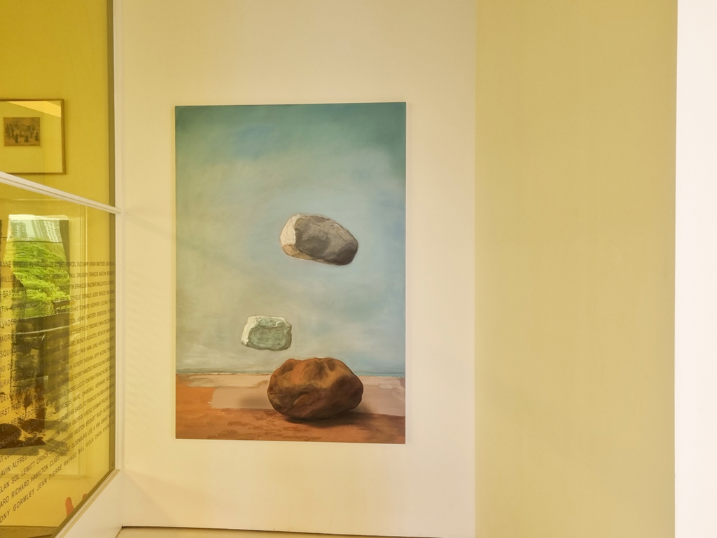 <적_자기복제>작품에서 상징적으로 무게감이 있는 돌덩이와 천으로 싸인 테이블이 공중에 부유하는 초현실적 화면을 담아낸다. 현실과 비현실, 실재와 허구의 경계를 넘나드는 환영적인 이미지들은 보는 이에게 상상할 수 있는 힘을 준다.